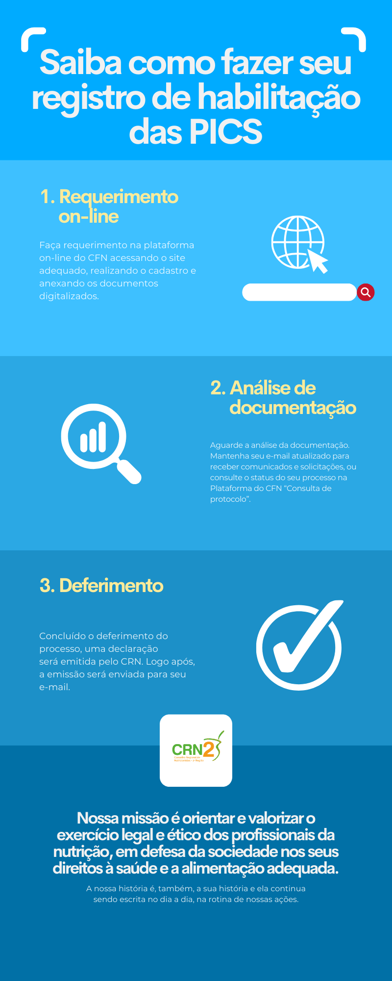 - Somente será permitida a adoção das PICS pelo nutricionista quando houver o deferimento do registro de habilitação, mediante o cumprimento dos requisitos para cada categoria, que estão dispostos no Anexo II da Resolução CFN N° 679/2021