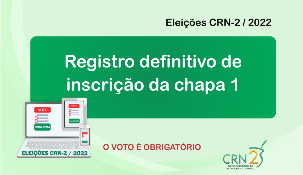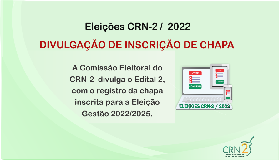 Comissão Eleitoral divulga o registro definitivo da única chapa inscrita, denominada chapa 1, que concorre à eleição do CRN-2, ...