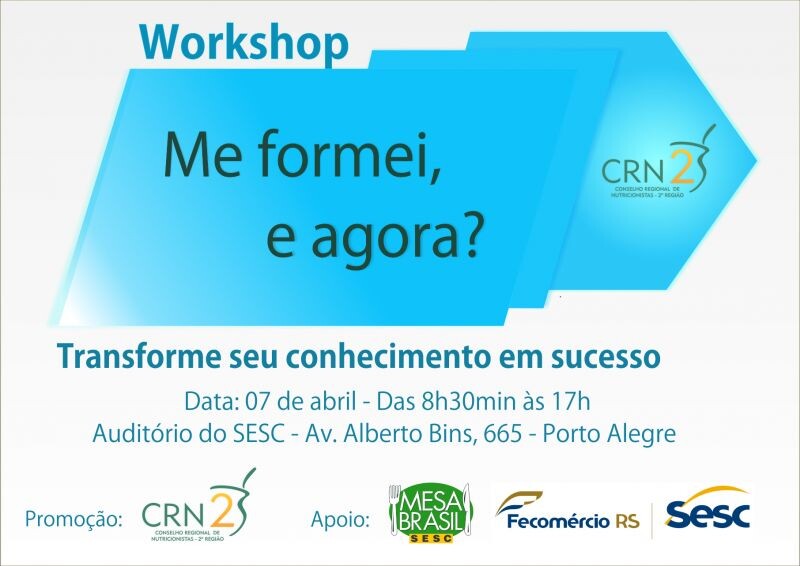 Para isso, estará promovendo o workshop "Me formei, e agora?”, que tem como objetivo fornecer informações técnicas, administrativas e outras que envolvem o planejamento para a inserção no mercado de trabalho. A iniciativa ocorrerá no dia 7 de abril, das 8h30min às 17h, no SESC, sala Érico Veríssimo, localizada à Avenida Alberto Bins, 665, 3º andar, em Porto Alegre/RS. O evento contará com palestras de especialistas, do Rio Grande do Sul e de outras regiões do Brasil, e com rodas de conversa.