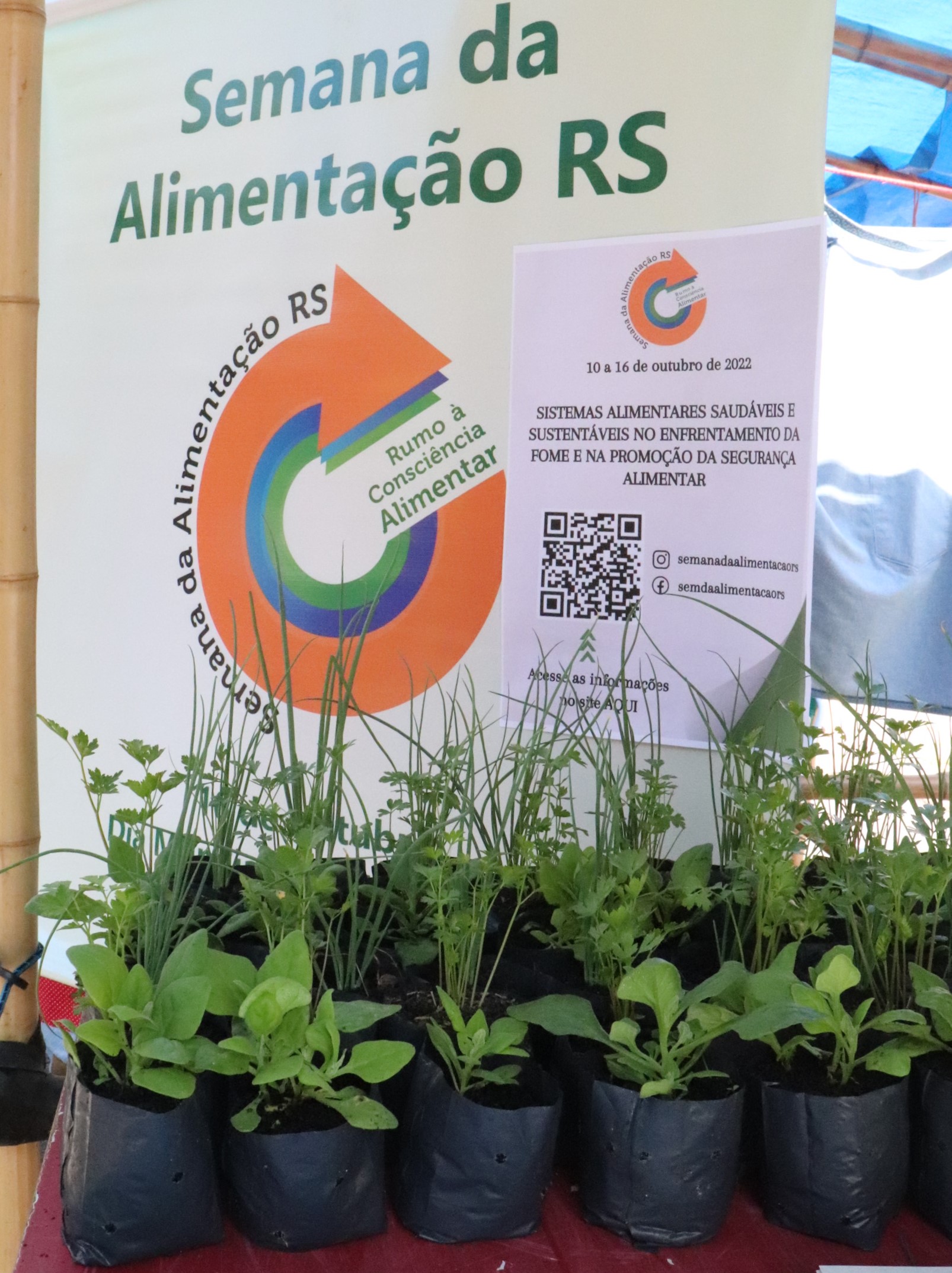 produção, o processamento e a distribuição de um alimento, até sua preparação e consumo. As mudas serviram como ferramenta para mostrar como é possível implementar hortas residenciais, que podem iniciar pelos temperos, em pequenos espaços ou vasos. Também, foram distribuídos marcadores de livros, contendo o QR Code da programação da Semana da Alimentação.