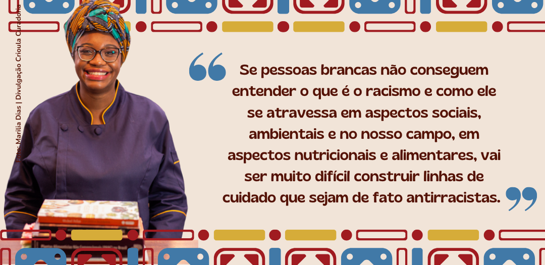 Eu não acho que só fazer oficinas de letramento racial seja o suficiente para que nutricionistas, sejam eles em processo de formação ou já formados, incorporem práticas antirracistas. Não é porque uma pessoa branca passa por uma oficina de letramento racial que ela vai compreender todas as dimensões, aspectos e níveis de profundidade do que é o racismo no Brasil. E eu vejo isso pelo simples fato das pessoas não aceitarem quando eu e outras profissionais (nutricionistas, pesquisadoras) falam em racismo alimentar. Eu tenho feito essa análise, que ainda é uma análise incipiente, mas é assim: o que não está dentro de injúria racial, aparentemente, para pessoas brancas, não é racismo. E isso é uma inverdade, é uma perversão, porque o racismo é um conjunto de fenômenos que vão oprimir pessoas racializadas na sua totalidade de vida. Então, se pessoas brancas não conseguem entender o que é racismo, entender que isso se atravessa em aspectos sociais, em aspectos ambientais e no nosso campo, em aspectos nutricionais e alimentares, vai ser muito mais difícil construir linhas de cuidado que sejam, de fato, antirracistas.
