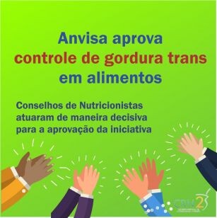 A iniciativa Pela Sa?de do Cora??o, Gordura Trans n?o!, uma parceria do Conselho Federal de Nutricionistas (CFN) e a Associa??o Brasileira de Nutri??o (Asbran) atuou ativamente pela aprova??o do controle da gordura trans em alimentos.
