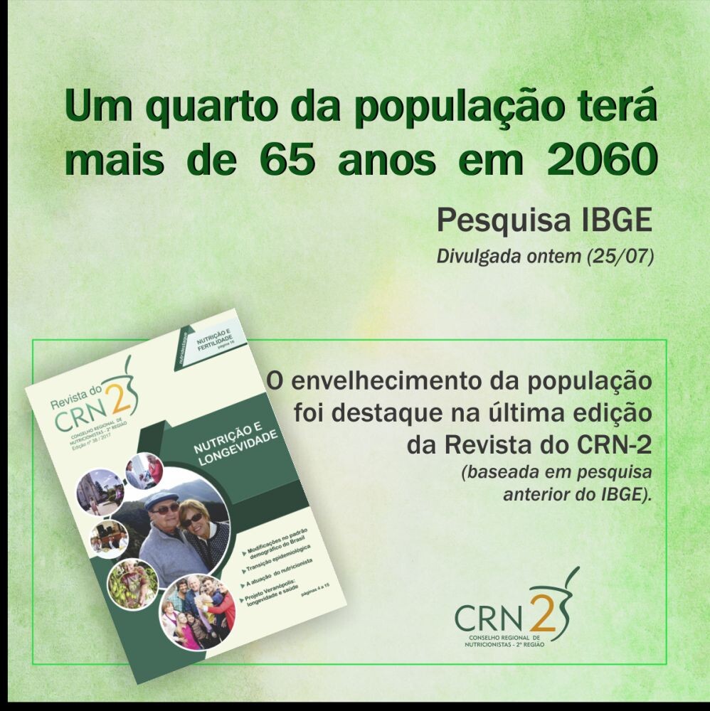 Em 2060, o percentual da população com 65 anos ou mais de idade chegará a 25,5% (58,2 milhões de idosos), enquanto em 2018 essa proporção é de 9,2% (19,2 milhões). Já os jovens (0 a 14 anos) deverão representar 13,9% da população (33,6 milhões) em 2060, frente a 21,9% (44,5 milhões) em 2018.